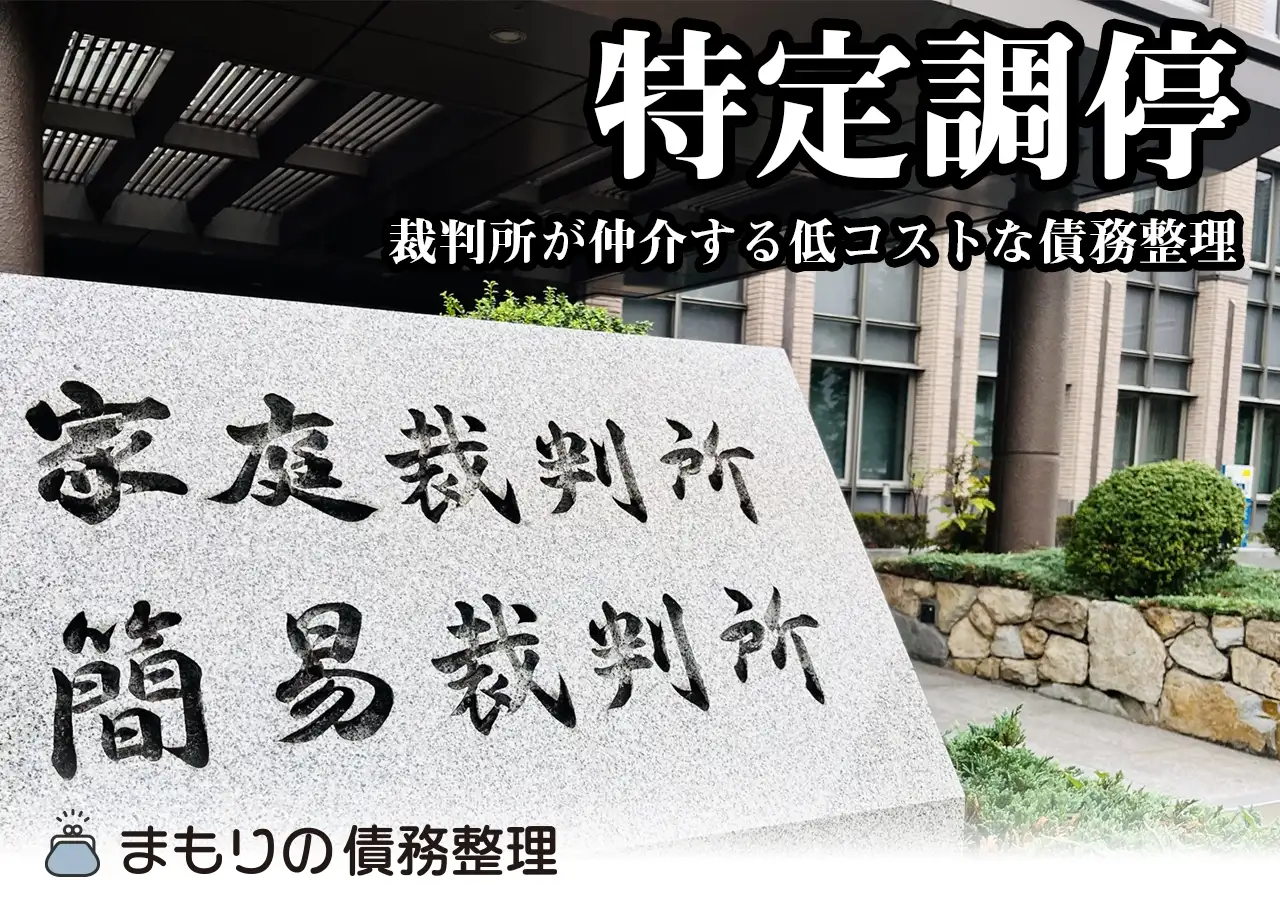 特定調停は、簡易裁判所の調停委員が間に入って債権者との返済条件の見直しを話し合う手続きです。弁護士なしで本人が申し立てでき、費用は1社あたり約500円と格安。ただし調停不成立のリスクがあり、近年は任意整理を選ぶ方が大半です。